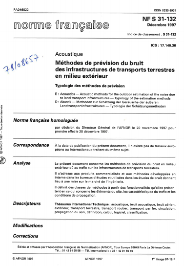 Norme NF S 31-132. Méthode de prévision du bruit des infrastructures de transports terrestres en milieu extérieur. Typologie des méthodes de prévision.