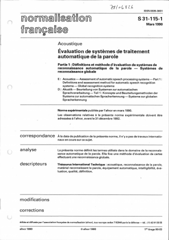 Norme S 31-115-1. Evaluation de système de traitement automatique de la parole, partie 1: définitions et méthodes d'évaluation de systèmes de reconnaissance automatique de la parole