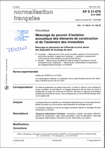 Norme XP 31-079. Mesurage du pouvoir d'isolation acoustique des éléments de construction et de l'isolement des immeubles.
