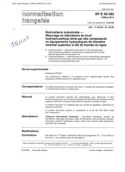 Norme XP E 29-380. Robinetterie industrielle. Mesurage en laboratoire du bruit hydroacoustique émis par des composants ou équipements hydrauliques de diamètre nominal supérieur à DN 32 montés en ligne