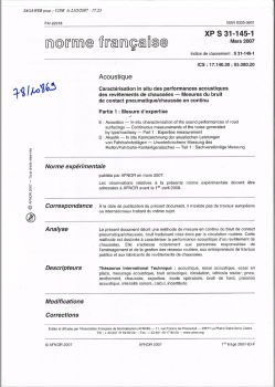 Norme XP S 31-145-1. Caractérisation in situ des performances acoustiques des revêtements de chaussées. Mesures du bruit de contact pneumatique/chaussée en continu. Partie 1 : Mesure d'expertise.