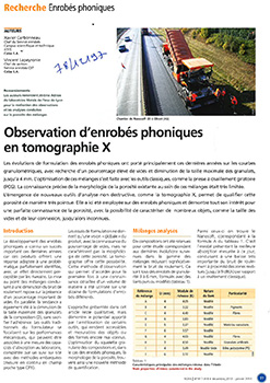 Les évolutions de formulation des enrobés phoniques ont porté principalement ces dernières années sur les courbes granulométriques, avec recherche d'un pourcentage élevé de vides et diminution de la taille maximale des granulats jusqu'à 4 mm. L'optimisation de ces mélanges s'est faite avec les outils classiques. La connaissance précise de la morphologie de la porosité existante au sein de ces mélanges était très limitée. L'émergence de nouveaux outils d'analyse non destructive, comme la tomographie X permet de qualifier cette porosité de manière très pointue. Cet article nous présente son emploi sur des enrobés phoniques et démontre tout son intérêt pour une parfaite connaissance de la porosité, pouvant caractériser de nombreux objets, comme la taille des vides et de leur connexion. -