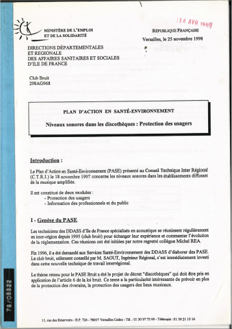 Rapport définitif élaboré par le groupe de travail bruit des services des DDASS d'Ile-de-France. Cette étude, portant sur le niveau sonore à l'intérieur des discothèques, a été réalisée avant la sortie du décret n° 98-1143 du 15 décembre 1998 relatif aux prescriptions applicables aux établissements ou locaux recevant du public et diffusant à titre habituel de la musique amplifiée. Elle représente un état des lieux dans 25 établissements de l'Ile-de-France. -