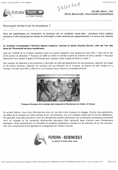 Quel est l'intérêts de la musique classique dans les grands magasins, des bandes-son des films ? Pourquoi un bébé se calme et s'endort quand sa maman se met à chanter ? Pourquoi dépensons-nous autant d'argent et d'énergie pour quelque chose d'apparemment inutile ? Pour essayer de répondre à ces questions, il faut aller du côté des laboratoires de neurosciences, observer les singes et les autres animaux, observer les nouveau-nés qui écoutent de la musique, et d'étudier de prêt l'oreille et le cerveau. On peut peut-être y découvrir si la musique nous a donné un avantage évolutif. Ensuite cet article aborde les effets de la musique sur notre cerveau et nos émotions. -