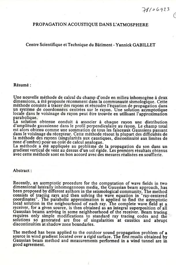 Application d'une nouvelle méthode de calcul du champ d'onde en milieu inhomogène à deux dimensions à la propagation du son dans un gradient vertical de vent au-dessus d'un sol rigide. Les premiers résultats obtenus sont en accord avec des mesures réalisées en soufflerie. -