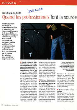 Interviewé par le magazine Travail & Sécurité, Frédéric Devinant, chargé de développement pour la prévention des risques auditifs au sein de la Nacre Rhône-Alpes (Nouvelle Agence Culturelle Régionale), constate qu'au quotidien les risques auditifs sont loin d'être une préoccupation majeure dans le spectacle vivant. Cependant, il ne désespère pas de trouver des solutions pour sensibiliser les professionnels. -