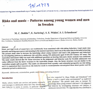 Les risques liés à la musique. Modèles chez les jeunes femmes et hommes en Suède. La musique écoutée à des niveaux sonores élevés peut intensifier l'expérience musicale, mais elle peut dans le même temps être nocive pour l'audition. Cette étude vise à accroître les connaissances sur l'évaluation des risques par les jeunes et les comportements associés. L'objectif est de mieux cerner les stratégies de prévention à mettre en place en s'attachant à comprendre les normes sociales et la dimension existentielle sous-jacentes dans la perception du risque. Un échantillon de 310 adolescents de 15-20 ans (143 femmes, 167 hommes) a été interrogé. -