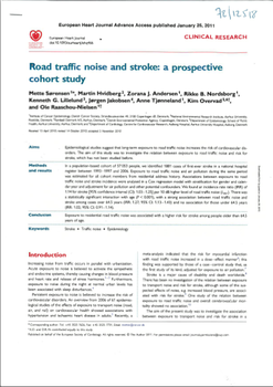 Dans une cohorte danoise de 57053 personnes, 1881 cas de premier AVC ont été identifiés. L'exposition au bruit et à la pollution de l'air a été estimée à partir des lieux successifs de résidence des personnes. Les associations trouvées entre l'exposition au bruit et la survenue d'AVC ont été analysées avec un modèle de régression de Cox avec une stratification sur le genre et sur l'année civile et un ajustement a été fait sur la pollution de l'air et sur d'autres facteurs de confusion. Une augmentation de 10dB du niveau sonore moyen pondéré Lden est associée à une augmentation du nombre d'AVC (RR=1,14). Ceci s'avère vrai uniquement chez les personnes de plus de 64,5 ans. -