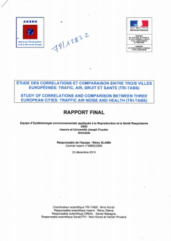 Étude des corrélations trafic, air, bruit et santé (tri-tabs) et comparaison entre trois villes européennes. Un protocole commun a été utilisé à Grenoble, Bâle (Suisse), Gérone (Espagne) pour mesurer le bruit, la concentration de particules dans l'air et la densité de la circulation en 40 à 60 emplacements de chaque ville. Bruit et niveaux de particules ultrafines avaient des corrélations relativement modestes. En ce qui concerne le bruit, l'application d'une modélisation de type Land Use Regression (LUR) pour caractériser la variabilité spatiale du bruit de trafic a été explorée. Elle constitue un outil prometteur pour l'estimation au bruit dans des études épidémiologiques. -