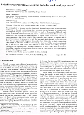 Les durées de réverbération convenant à des salles de musique rock et pop. Résultats de mesures effectuées dans 20 salles de musiques amplifiées au Danemark, accompagnées d'un questionnaire d'évaluation passé auprès des musiciens professionnels et des ingénieurs du son. Les salles les mieux notées ont une durée de réverbération de 0,6 à 1,2 secondes indépendantes des fréquences, pour des volumes de 1000 à 6000 m3. Les salles les moins bien notées ont des durées bien plus élevées dans les fréquences de 63 et 125 Hz. Les spectateur absorbent cinq fois plus d'énergie dans les moyennes et hautes fréquences que dans les basses. -