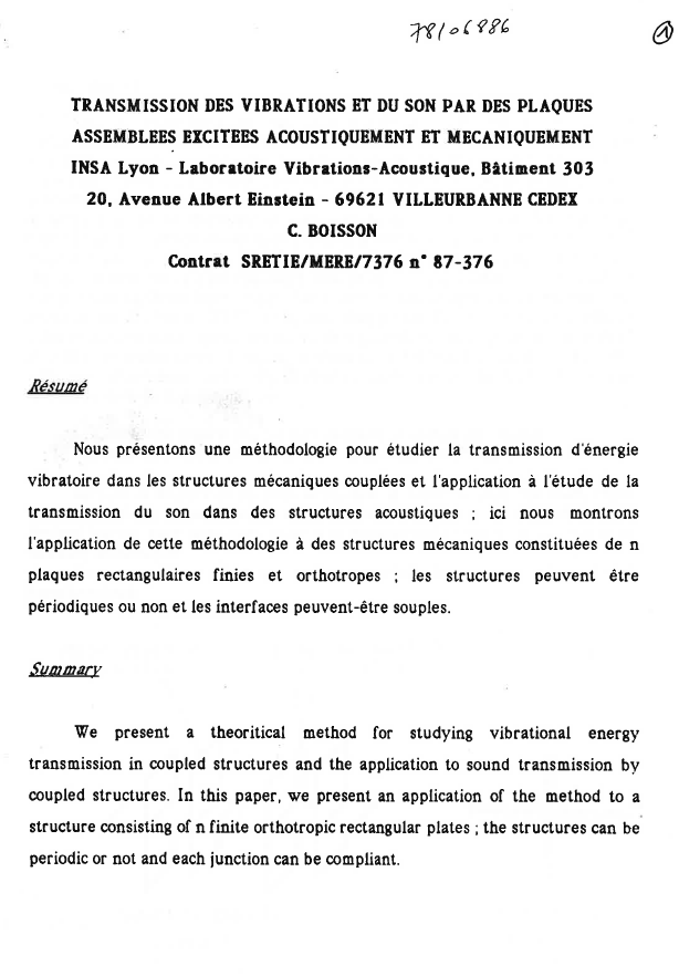 Transmission des vibrations et du son par des plaques assemblées excitées acoustiquement et mécaniquement. In: Huitième symposium Bruit et vibrations, La Rochelle, 21-23 Mai 1990