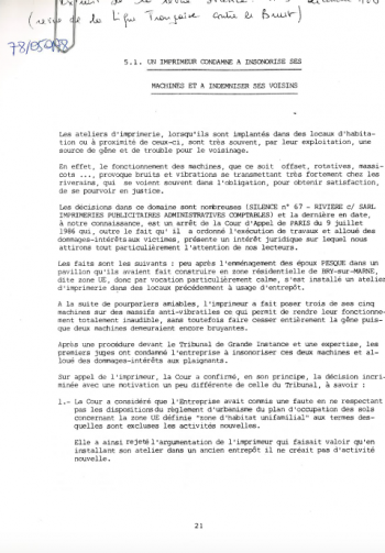 Texte et commentaire d'un arrêt de la Cour d'appel de Paris du 9 juillet 1986. condamnant l'imprimeur à des travaux d'isolation acoustique et à verser des dommages et intérêts aux plaignants. Intéressant car il se fonde sur le non respect du plan d'occupation des sols et sur la recommandation du ministère de la Santé de 1963. -