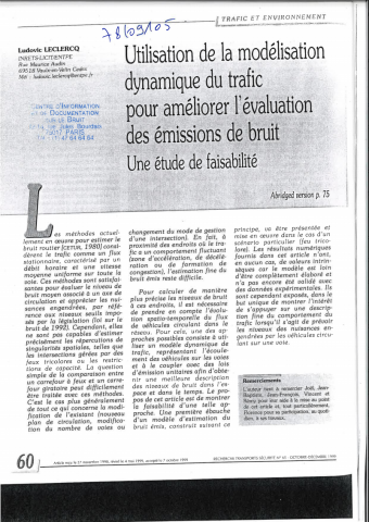 Faisabilité de la construction d'un modèle d'estimation du bruit émis par un flot de véhicules, fondé sur un modèle de trafic fournissant la représentation dynamique de l'écoulement. Sont présentés tout d'abord les enjeux et la démarche d'élaboration d'un tel modèle de calcul des émissions de bruit. Puis est abordé le problème du choix du modèle de trafic le mieux adapté pour estimer le bruit. Enfin, le modèle est mis en œuvre et testé, à titre d'exemple, dans le cas d'un feu tricolore, afin de montrer la finesse de description du bruit émis ainsi obtenue. -