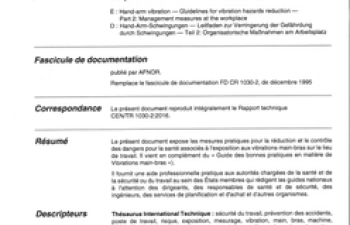 Norme FD CEN/TR 1030-2. Vibrations main-bras. Guide pour la réduction des risques de vibrations. Partie 2 : mesures de prévention sur le lieu de travail.