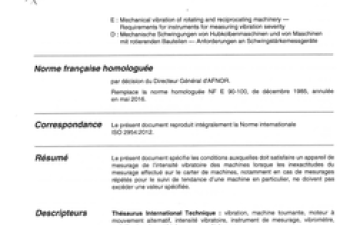 Norme NF ISO 2954. Vibrations mécaniques des machines tournantes ou alternatives. Exigences relatives aux appareils de mesure de l'intensité vibratoire.