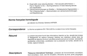 Norme NF EN 1794-3. Dispositifs de réduction du bruit du trafic routier. Performance non acoustique. Partie 3 : Réaction au feu. Comportement au feu des dispositifs de réduction du bruit et classification.