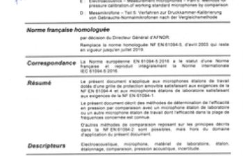 Norme NF EN 61094-5. Électroacoustique. Microphones de mesure. partie 5 : Méthodes pour l'étalonnage en pression par comparaison des microphones étalons de travail.