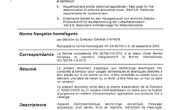 Norme NF EN 60704-2-6. Appareils électrodomestiques et analogues. Code d'essai pour la détermination du bruit aérien. Partie 2-6 : Règles particulières pour les sèche-linge à tambour.