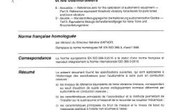 Norme NF EN ISO 389-3. Acoustique. Zéro de référence pour l'étalonnage d'équipements audiométriques. Partie 3 : Niveaux de référence équivalents de force vibratoire liminaires pour les vibrateurs à sons purs et les ossivibrateurs