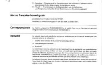 Norme NF EN ISO 6926. Acoustique. Prescriptions relatives aux performances et à l'étalonnage des sources sonores de référence pour la détermination des niveaux de puissance acoustique
