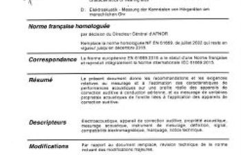 Norme NF EN 61669. Électroacoustique. Mesure des caractéristiques de performances acoustiques des appareils de correction auditive sur une oreille réelle.