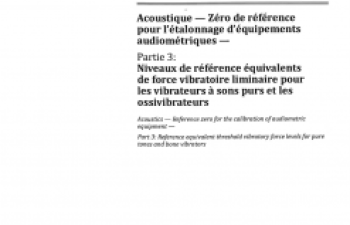Norme ISO 389-3. Acoustique. Zéro de référence pour l'étalonnage d'équipements audiométriques. Partie 3 : Niveaux de référence équivalents de force vibratoire liminaire pour les vibrateurs à sons purs et les ossivibrateurs