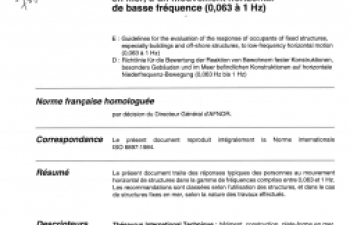 Norme NF ISO 6897. Guide pour l'évaluation de la réponse des occupants de structures fixes, en particulier de bâtiments et de structures en mer, à un mouvement horizontal de basse fréquence (0,063 à 1 Hz).