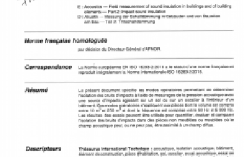 Norme NF EN ISO 16283-2. Acoustique. Mesurage in situ de l'isolation acoustique des bâtiments et des éléments de construction. Partie 2 : isolation des bruits d'impact
