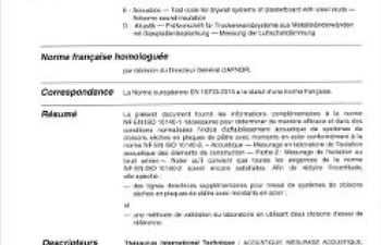 Norme NF EN 16703. Acoustique. Code d'essai pour systèmes de cloisons sèches en plaques de plâtre avec montants en acier. mesure de l'affaiblissement aérien