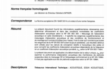 Norme NF EN 16487; Acoustique. Code d'essai des plafonds suspendus. absorption acoustique
