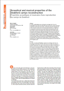 In 1992 a multidisciplinary team including the musicologist John Purser, the archaeologist Fraser Hunter, the silversmith John Creed and the musician John Kenny undertook a reconstruction of the carnyx, a Celtic brass instrument characterised by a bell in the form of a boar’s head. The reconstruction was based on a fragment of a carnyx which was discovered in the early nineteenth century buried on farm land near Deskford in north-east Scotland. Since only the head of the Deskford carnyx has survived, decisions on the length and bore profile of the tube and the nature and orientation of the mouthpiece were guided by images of the carnyx on vessels and coins from the early part of the Christian era, and by acoustical considerations based on calculations and measurements on a prototype. In 2004 excavations at Tintignac in Correze,France revealed a collection of bronze tubing including parts of several carnyxes. The present paper reviews the acoustical and musical behaviour of the Deskford reconstruction, and reconsiders the decisions taken in 1992 in the light of the new information from Tintignac and the extensive performing experience of John Kenny over the last eighteen years. En 1992, une équipe pluridisciplinaire composée du musicologue John Purser, de l’archéologue Fraser Hunter, de l’orfèvre John Creed et du musicien John Kenny ont entrepris la reproduction d’un carynx, un instrument à vent celtique caractérisé par une bouche en forme de hure de sanglier. Cette reproduction est basée sur un fragment d’un carynx qui a été découvert au début du 19eme siècle enterré dans le champ d’une ferme près de Deskford au nord est de l’Écosse. Bien que seulement la tête du carynx ait survécu, les choix de la longueur et du profil de l’alésage du tube ainsi que ceux portant sur la nature et l’orientation de l’embout buccal ont été effectués à partir d’images de carynx sur des vaisseaux ou des pièces de monnaie provenant du début de l’ère chrétienne, et par des considérations acoustiques basées les calculs et les mesures effectués sur un prototype. En 2004, des fouilles à Tintignac en Corrèze, France ont révélé une collection de tubes en bronze comprenant des parties de nombreux carynx. Cet article présente les comportements acoustiques et musicaux de la reproduction, et reconsidère les choix pris en 1992 à la lumière des nouvelles informations provenant de Tintignac et de l’immense expérience de John Kenny en matière de spectacle tout au long des 18 dernières années.
