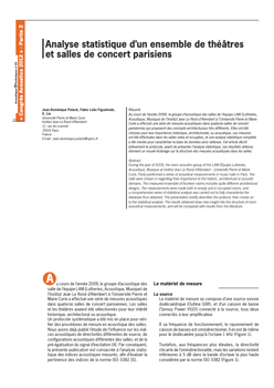 "Au cours de l’année 2009, le groupe d’acoustique des salles de l’équipe LAM (Lutheries, Acoustique, Musique) de l’Institut Jean Le Rond d’Alembert à l’Université Pierre et Marie Curie a effectué une série de mesures acoustiques dans quatorze salles de concert parisiennes qui proposent des concepts architecturaux très différents. Elles ont été choisies pour leur importance historique, architecturale, ou acoustique. Les mesures ont été effectuées dans les salles vides et occupées, et une analyse statistique complète a été menée pour caractériser la base de données ainsi obtenue. Cet article décrit brièvement le protocole, avant de présenter l’analyse statistique. Les résultats obtenus donnent un nouvel éclairage sur la structure des mesures acoustiques dans les salles." -
