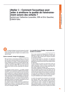 Article basé sur un atelier dont la thématique était : Comment l’acoustique peut aider à améliorer la qualité de l’environne- ment sonore des enfants ? Animé par Catherine Lavandier de la SFA et Eric Gaucher du CINOV-GIAc, plusieurs questionsconcernant les indicateurs de bruit et de sommeil, les nouvelles façons d'habiter, la qualité du sommeil et l'architecture sont abordées. -