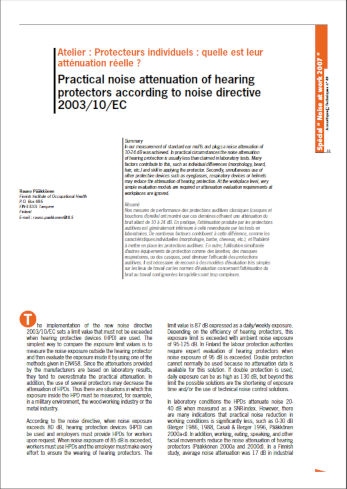 In our measurement of standard ear muffs and plugs a noise attenuation of 10-24 dB was achieved. In practical circumstances the noise attenuation of hearing protection is usually less than claimed in laboratory tests. Many factors contribute to this, such as individual differences (morphology, beard, hair, etc.) and skill in applying the protector. Secondly, simultaneous use of other protective devices such as eyeglasses, respiratory devices or helmets may reduce the attenuation of hearing protection. At the workplace level, very simple evaluation models are required or attenuation evaluation requirements at workplaces are ignored. Nos mesures de performance des protections auditives classiques (casques et bouchons d’oreille) ont montré que ces dernières offraient une atténuation du bruit allant de 10 à 24 dB. En pratique, l’atténuation produite par les protections auditives est généralement inférieure à celle revendiquée par les tests en laboratoires. De nombreux facteurs contribuent à cette différence, comme les caractéristiques individuelles (morphologie, barbe, cheveux, etc.), et l’habileté à mettre en place les protections auditives. En outre, l’utilisation simultanée d’autres équipements de protection comme des lunettes, des masques respiratoires, ou des casques, peut diminuer l’efficacité des protections auditives. Il est nécessaire de recourir à des modèles d’évaluation très simples sur les lieux de travail car les normes d’évaluation concernant l’atténuation du bruit au travail sont ignorées lorsqu’elles sont trop complexes.