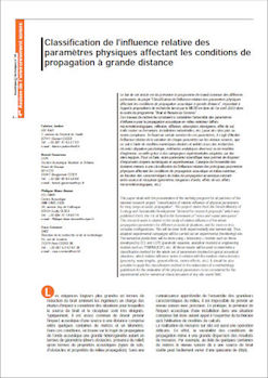 Le but de cet article est de présenter le programme de travail commun des différents partenaires du projet “Classifi cation de l’infl uence relative des paramètres physiques affectant les conditions de propagation acoustique à grande distance”, répondant à l’appel à propositions de recherche lancé par le MEDD en date du 1er avril 2003 dans le cadre du programme “Bruit et Nuisances Sonores”. Ces travaux de recherche consistent à considérer l’ensemble des paramètres d’infl uence pour la propagation acoustique en milieu extérieur (effets micrométéorologiques, réfl exion, diffusion, absorption, divergence, effet de sol, trafi c routier ou ferroviaire, installations industrielles, etc.) pour des sites plus ou moins complexes. En fi xant un certain nombre de ces paramètres, il s’agit d’étudier l’infl uence relative de la variation de chaque paramètre sur les niveaux sonores, que ce soit à l’aide de modèles numériques évolués et validés issus des recherches récentes (équation parabolique, méthodes analytiques diverses) ou de modèles d’ingénierie, ou enfi n grâce à des campagnes expérimentales adaptées sur des sites équipés. Pour ce faire, notre partenariat scientifi que nous permet de disposer d’importants moyens numériques et expérimentaux. L’analyse de l’ensemble des données mènera à une classifi cation de l’infl uence relative des principaux paramètres physiques affectant les conditions de propagation acoustique en milieu extérieur, en fonction des caractéristiques du milieu de propagation acoustique existant entre source et récepteur (géométrie, longueurs d’onde, effets de sol, effets micrométéorologiques, etc.).