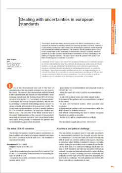 “Uncertainty” should have always been a key word in the fi eld of standardization as many standards are devoted to providing methods for measuring quantities of all kinds. However, it is only relatively recently that it was realized that all metrological standards should absolutely and systematically deal with uncertainties. This resulted in specifi c guidance given in 2004 at the European level on the “uncertainty of measurement concept in European Standards” provided by CEN (the European Standardization Committee) to all those contributing to the drafting of European standards. This paper reports about this guidance that applies to all fi elds of metrology and, in particular, to acoustics. L’incertitude devrait toujours avoir été un mot clé dans le domaine de la normalisation puisque les normes sont destinées à fournir des méthodes de mesure pour toutes sortes de choses. Toutefois, ce n’est que relativement récemment qu’on a pris conscience que toutes les normes en métrologie devraient absolument et systématiquement prendre en compte les incertitudes. Cela a abouti à un guide spécifi que paru en 2004 au niveau européen sur «le concept d’incertitude de mesure dans les normes européennes» produit par le CEN pour tout ceux qui contribuent à éditer des normes européennes. Cet article présente ce guide qui s’applique à tous les domaines de la métrologie et en particulier, à l’acoustique. -