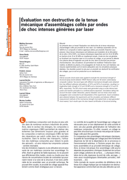 On présente dans ce travail l’évaluation non destructive de la tenue mécanique d’assemblages collés par procédé de choc laser. Les matériaux assemblés sont du Ta6V4 et un composite à matrice organique obtenu par procédé d’injection sous pression. Deux tenues mécaniques sont obtenues par modulation de la réticulation de la colle, à 50 et 90%. Les tenues mécaniques respectives sont de 10 et 39 MPa en traction et de 15 et 35 MPa en cisaillement simple. L’onde de choc est générée en focalisant une impulsion laser ns à la surface du collage, ce qui permet la détente d’un plasma dense et engendre une onde de choc dans la structure par principe d’action/réaction. Des simulations 1D permettant de modéliser l’interaction laser/ matière, la détente du plasma, et la propagation de l’onde de choc sont réalisées. Les mesures expérimentales sont en bonne adéquation avec les simulations physiques réalisées. Ces résultats ouvrent la voie pour un procédé non destructif de certification des collages, que ce soit en production ou en maintenance. -
