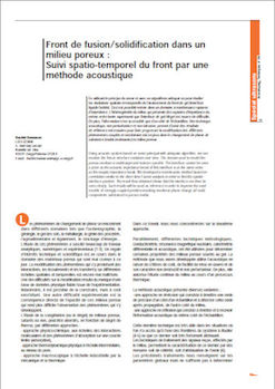 En utilisant le principe du sonar et avec un algorithme adéquat on peut étudier les évolutions spatiale et temporelle de l’avancement du front de gel (interface liquide/solide). Ceci est possible même dans un domaine à nombreuses ruptures d’impédance. L’hétérogénéité du milieu qui présente des ruptures d’impédance du même ordre (voire supérieure) que l’interface de gel/dégel est source de diffi culté. De plus, l’information n’est accessible que d’un côté de l’échantillon. Une technique acoustique, non perturbatrice et non intrusive, permet d’avoir des résultats de référence nécessaires pour faire progresser la modélisation des différents phénomènes couplés et non-linéaire mis en jeux dans le changement de phase de substance (multiconstituants) en milieu poreux. -