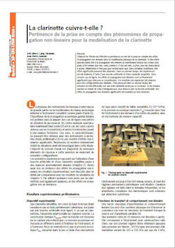 L’objectif de l’étude est d’étudier la pertinence ou non de la prise en compte des effets de propagation non-linéaire dans la modélisation physique de la clarinette. Si des effets spectaculaires liés à la propagation non-linéaire se manifestent lorsque les cuivres sont joués à fort niveau (cas des «sons cuivrés»), il n’en est rien, a priori, pour les instruments à anche. Néanmoins il n’est pas pour autant exclu que, dans certaines conditions, des effets significatifs puissent être observés. Dans un premier temps, des expériences ont été réalisées à l’aide d’une bouche artificielle et d’une clarinette simplifiée. Dans certains cas de figure, les effets de propagation non-linéaires sont suffisamment significatifs pour être pris en considération. Ces résultats ont cependant été obtenus pour des configurations peu réalistes. C’est pourquoi dans un second temps des mesures ont été effectuées sur une vraie clarinette jouée par un musicien. Si les niveaux sonores en entrée de tube n’atteignent pas ceux obtenus avec la bouche artificielle, des effets de propagation non-linéaires significatifs ont toutefois pu être observés. -
