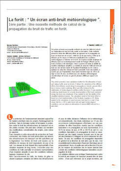Nouvelle méthode de calcul de l'effet de la forêt sur l'atténuation du bruit de trafic routier ou ferroviaire. Cette méthode permet le calcul des différents effets qui agissent sur la propagation du bruit à la traversée de la forêt : l'effet de sol de type humus, l'effet de la diffusion par les troncs et l'effet de la stabilisation des conditions météorologiques à l'intérieur de la forêt. -
