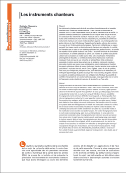 Les instruments chanteurs sont nés de la rencontre entre synthèse vocale et nouvelles interfaces pour l’interaction humain-machine. La voix n’est pas un instrument de musique, car il n’y a pas d’objet externe mis en jeu par les membres ou par le souffle. La synthèse numérique permet pour la première fois une coupure entre le sujet et sa voix, en construisant des instruments chanteurs manipulés par les mains, les pieds, ou par toutes sortes d’interfaces humain-machine. Cependant, les possibilités de contrôle des instruments chanteurs sont encore limitées à certains aspects, car une transposition des gestes internes du chant effectués par l’appareil vocal en gestes externes des membres ne va pas de soi. Certains gestes sont analogues, d’autres sont médiatisés par un espace perceptif. Les travaux menés sur trois instruments chanteurs sont présentés : le contrôle de l’intonation par un stylet sur une tablette graphique et des gestes d’écriture ; le contrôle des voyelles et de la qualité vocale sur une surface ; le contrôle bimanuel de l’articulation consonantique ; le contrôle syllabique du rythme. Les modèles de synthèse sous-jacents utilisent soit la simulation du modèle source-filtre, soit la modification d’échantillons préenregistrés et étiquetés. Le contrôle des instruments chanteurs est multimodal, impliquant l’ouïe ainsi que la vue, le toucher, et la kinesthésie. Cette combinaison sensorielle et motrice permet dans certains cas de rendre les instruments chanteurs plus justes et précis que la voix, la vue privilégiant les aspects mélodiques et l’audition les aspects rythmiques. Miroir de la voix, l’instrument chanteur autorise toutes sortes de spéculations : musicales bien sûr, avec le Chorus Digitalis, chœur de voix de synthèse, mais aussi pour l’analyse des pratiques vocales, pour l’éducation ou la rééducation, en renforçant l’apprentissage de gestes vocaux par des traces visuelles, des gestes manuels ou corporels. Le statut symbolique de la voix est également affecté par la possibilité de contrôler et de produire le son vocal en dehors du corps : corps augmenté, mise en scène de l’expression vocale, double de la voix, jeu de la voix d’un ou d’une autre.