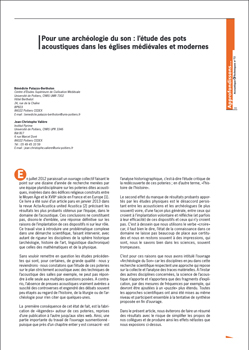 En juillet 2012 paraissait un ouvrage collectif faisant le point sur une dizaine d’année de recherche menées par une équipe pluridisciplinaire sur les poteries dites acousti- ques, insérées dans des édifices religieux construits entre le Moyen Âge et le xvIII e siècle en France et en Europe [1]. Ce livre a été suivi d’un article paru en janvier 2013 dans la revue Acta-Acustica united Acustica [2] précisant les résultats les plus probants obtenus par l’équipe, dans le domaine de l’acoustique. Ces conclusions ne constituent pas, disons-le d’emblée, une réponse définitive sur les raisons de l’implantation de ces dispositifs ni sur leur rôle. Ce travail vise à introduire une problématique complexe dans une démarche scientifique, faisant intervenir, avec autant de rigueur les disciplines de la sphère historique (archéologie, histoire de l’art, linguistique diachronique) que celles des mathématiques et de la physique. -