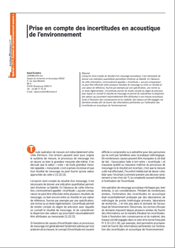 Lorsqu’on rend compte du résultat d’un mesurage acoustique, il est nécessaire de donner une indication quantitative permettant d’estimer sa fiabilité. En l’absence de cette information, communément appelée « incertitude », aucune comparaison ne peut être effectuée entre plusieurs résultats de mesurage ou entre un résultat et une valeur de référence, fournie par exemple par une spécification, une norme ou un texte réglementaire. L’incertitude permet de rendre compte du degré de précision avec lequel on connaît le résultat de mesurage et permet de caractériser la dispersion des valeurs qui pourraient raisonnablement être attribuées à une mesure acoustique. Suite à l’évolution des connaissances et du matériel, des travaux ont été engagés ces dernières années afin de fournir des informations pertinentes sur l’estimation des incertitudes en acoustique de l’environnement. -