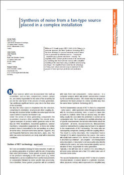 Within an EC Growth project GRD1-1999-10785 ‘Nabucco’ a particular approach, the Noise Synthesis Technology (NST), has been developed. It concerns industrial products where noise is generated by individual sources – components – implanted into a passive main frame – housing. The originality of NST is that it predicts trends in the overall noise by combining data from real noise sources with a simplifi ed modelling of the main frame using a modifi ed sub-structuring technique. The simplifi ed frame model has the advantage of being more robust and more easy to implement for the purpose of noise spectrum prediction and auralisation. -