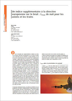 Dans le domaine des réglementations relatives au bruit, les récentes directives européennes sur le bruit au travail, sur le bruit émis par les machines à usage extérieur, et sur le bruit de l’environnement vont amener des modifications sensibles. Publié en juin 2002, le texte concernant l’évaluation et le contrôle du bruit de l’environnement (cf. : Acoustique et Techniques 29) a fait l’objet d’une préparation longue, depuis le premier rapport Lambert-Vallet de 1994. Le groupe de travail 1, chargé de la réflexion sur les indices de bruit a proposé l’indice Lden 24 heures. Après une discussion serrée, un indice spécifique pour la nuit (Leq de nuit) a été retenu, pour éviter un transfert du trafic du jour vers la nuit, en cas de période diurne peu chargée. L’article 5 du texte précise les indices acoustiques retenus : Lden et Ln. Au paragraphe 2 de cet article, il est écrit que «les pays membres peuvent utiliser des indicateurs de bruit supplémentaires, pour des cas particuliers comme ceux cités en annexe». La première application possible de cette disposition intervient «lorsque le bruit apparaît pendant une petite fraction du temps, c’est- à-dire 20 % ; la seconde concerne les situations où le nombre moyen d’événements bruyants est bas, un événement durant moins de 5 minutes». Dans ce cas, «Lmax ou SEL peuvent être utilisés pour la période de nuit, et la protection contre les crêtes de bruit» -