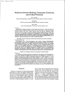 Relations entre masquage, émissions oto-acoustiques et potentiels évoqués. Les résultats obtenus confirment l'hypothèse que le masquage BF se développe à l'intérieur même de la cochlée. Si des bouffées de sons-tests sont masquées totalement du point de vue de la psychoacoustique, elles seront également sans effets sur les émissions oto-acoustiques ainsi que sur les potentiels évoqués transcérébraux. -