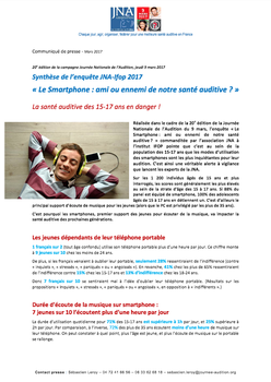 La Journée Nationale de l’Audition a demandé à l’institut IFOP de réaliser une enquête relative au comportement des jeunes vis-à-vis de l’écoute de la musique via leur smartphone. Cette enquête « Le Smartphone, ami ou ennemi de notre santé auditive ? » a été réalisée dans le cadre de la 20ème édition de la JNA qui aura lieu le 9 mars 2017 avec des actions de prévention sur l’audition partout en France. -