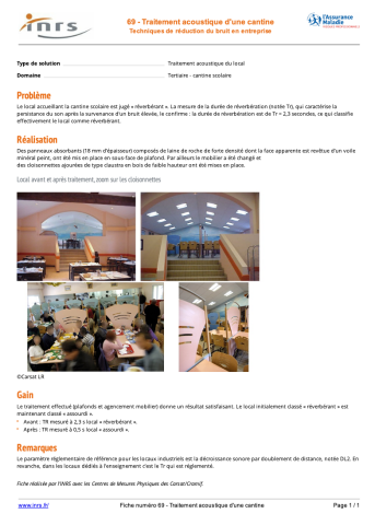 L’objectif de cette fiche est de montrer comment améliorer l’acoustique d’une cantine scolaire trop réverbérante. Le local présentait une durée de réverbération de 2,3 secondes, ce qui le rendait bruyant et inconfortable. L’intervention a consisté à poser des panneaux absorbants en sous-face de plafond, à renouveler le mobilier et à installer des cloisonnettes ajourées de type claustra. Ces aménagements ont permis de réduire la réverbération à 0,5 seconde, transformant ainsi le local en un espace « assourdi ». La fiche rappelle également que, pour ce type de locaux, la durée de réverbération est le critère réglementaire à prendre en compte, contrairement aux environnements industriels où l’on mesure plutôt la décroissance sonore avec la distance. Elle sert d’exemple concret et reproductible pour illustrer comment traiter efficacement le bruit dans des espaces collectifs. -