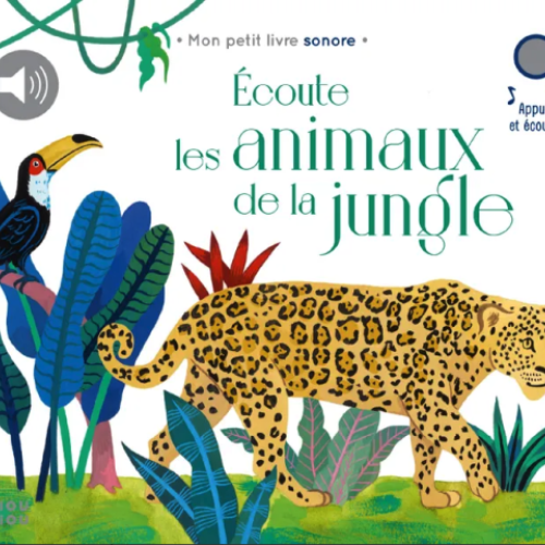 Un livre sonore exotique de 5 puces pour découvrir les sons des animaux emblématiques de la jungle amazonienne : le toucan, le singe araignée, le paresseux, la dendrobate bleue (grenouille) et le jaguar. Chaque cri d’animal est intégré dans une ambiance sonore naturelle et authentique : le piaillement des toucans gourmands et le cri des singes malicieux se mêlent aux bruits de la nature, le son du paresseux et le rugissement du jaguar aux chants des oiseaux, le coassement de la grenouille au bruit de l’eau…Le tout-petit pourra ainsi découvrir les animaux sauvages en liberté dans leur environnement naturel. -