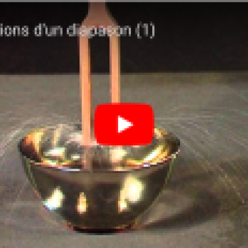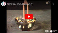 Lorsqu'on frappe les branches d'un diapason, celles-ci se mettent en vibration et l'instrument émet un son. L'amplitude de ces vibrations est trop faible pour être vue directement, mais on peut facilement les mettre en évidence, grâce à un verre rempli d'eau. Comment faire ? Regardez... -